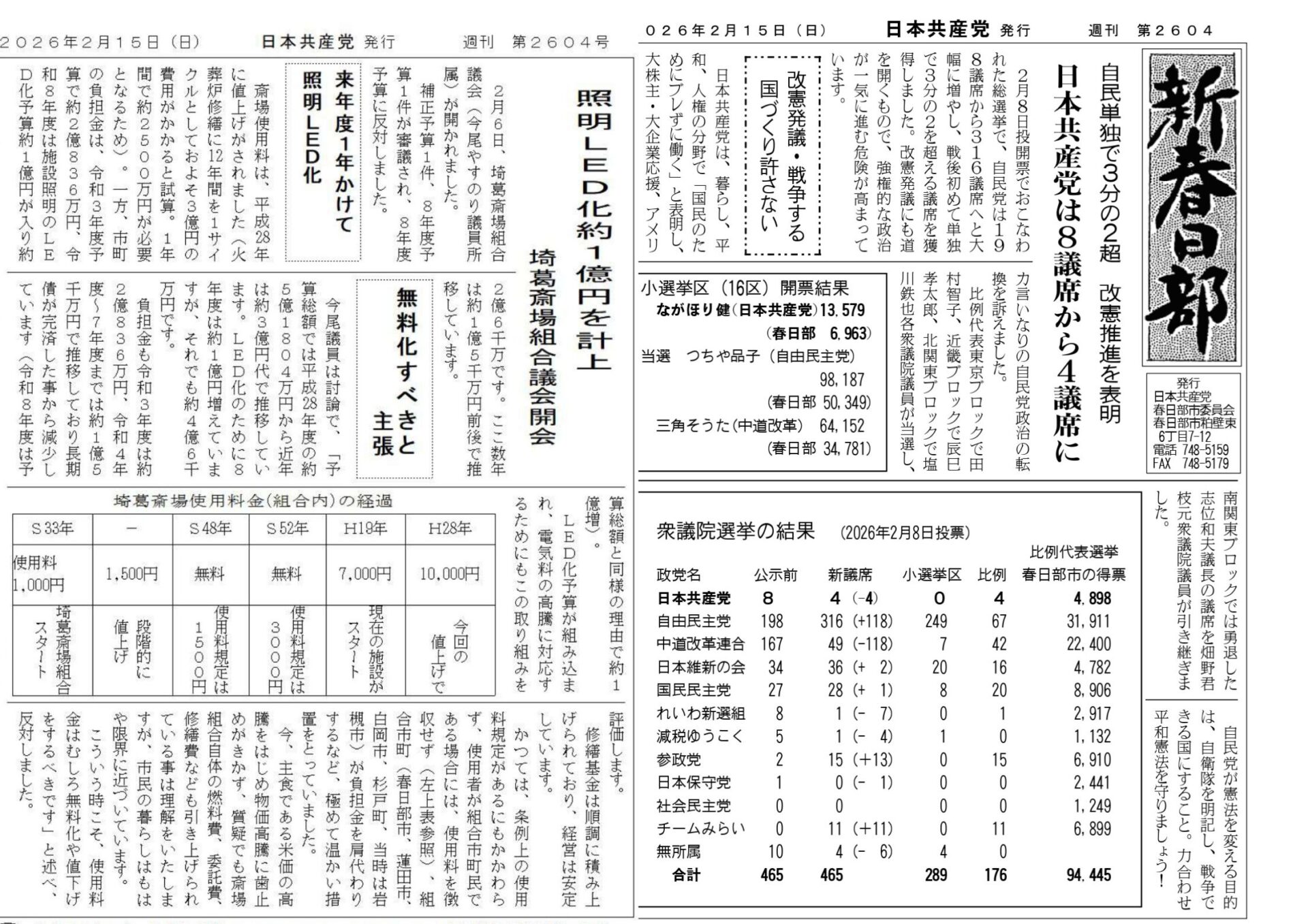 ● 新春日部2/15№2604衆院選2026結果平和憲法を守ろう(2026年02月12日)