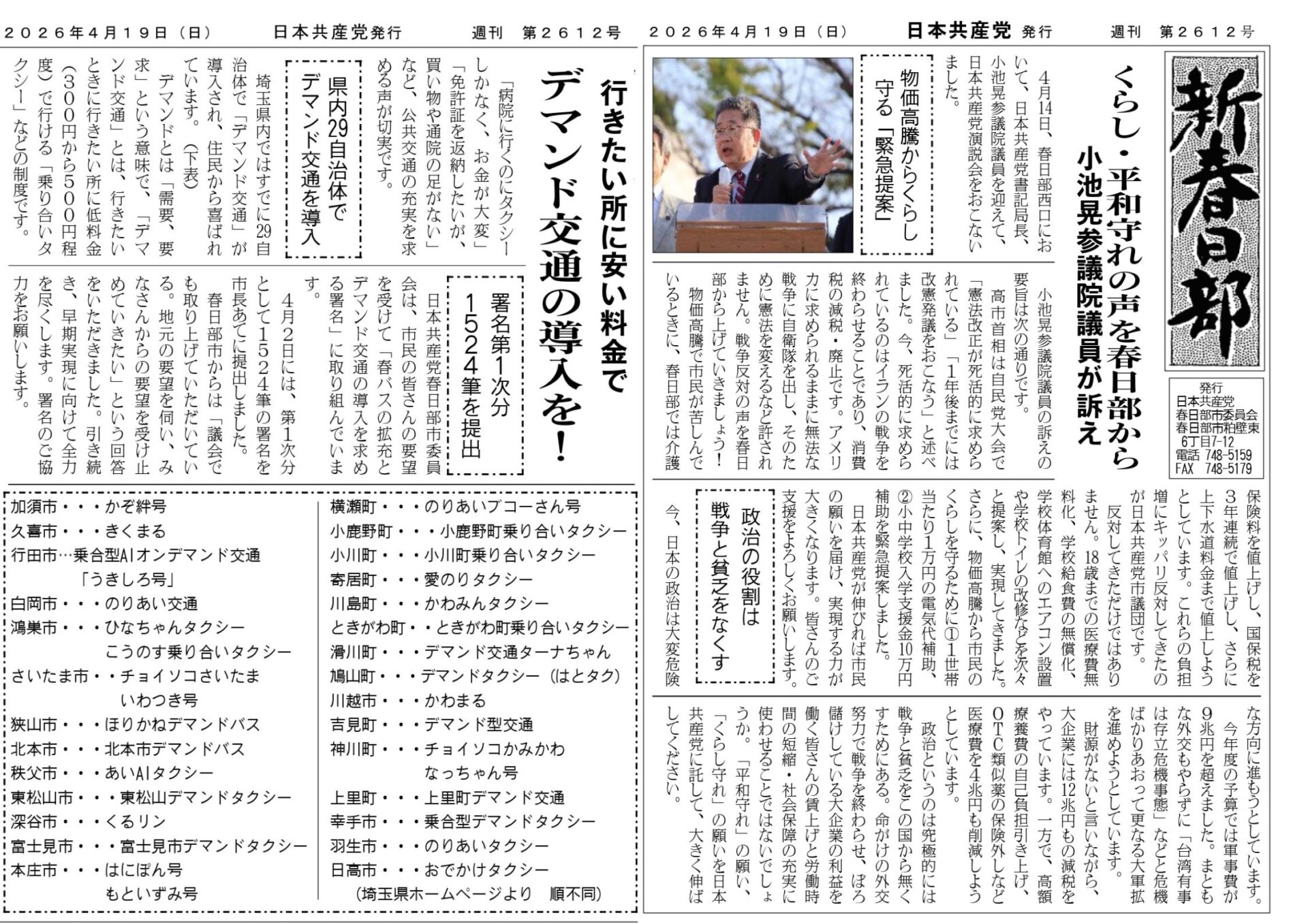 ● 新春日部4/19№2612くらし・平和守れの声を春日部から(2026年04月17日)